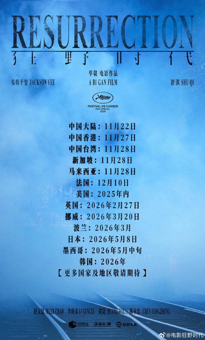 据电影《狂野时代》官方微博,由毕赣执导,易烊千玺、舒淇领衔主演,赵又廷特邀主演、李庚希特别主演、黄觉、陈永忠主演的电影《狂野时代》,宣布定档11月22日在中国大陆上映。